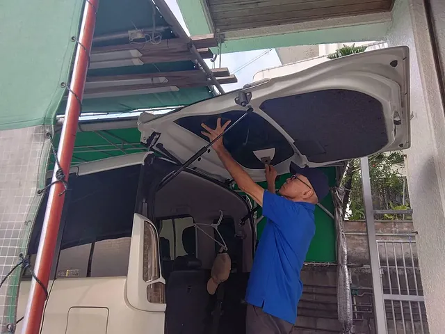 朝一番、作業場の車スペースに停められたこのシルバーのバン。窓にはしっかりとしたーフィルムが施工されていて、外からは中の様子がほとんど見えません。