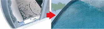ドアガラスは右写真のように、 割れた場合に細かく割れて飛び散ってしまう為、ガラスの飛散による怪我の危険性が高い事が懸念されていますが、フィルムを貼ることで、 右写真のようにガラスの飛び散りを最小限に抑える事が出来るので安全です。
